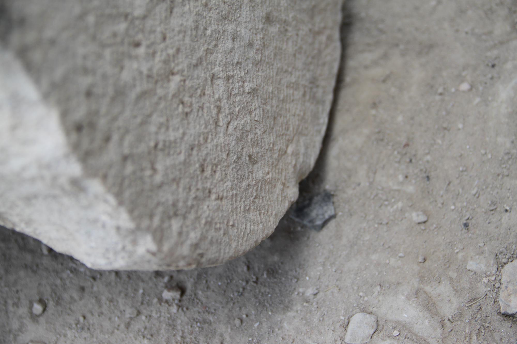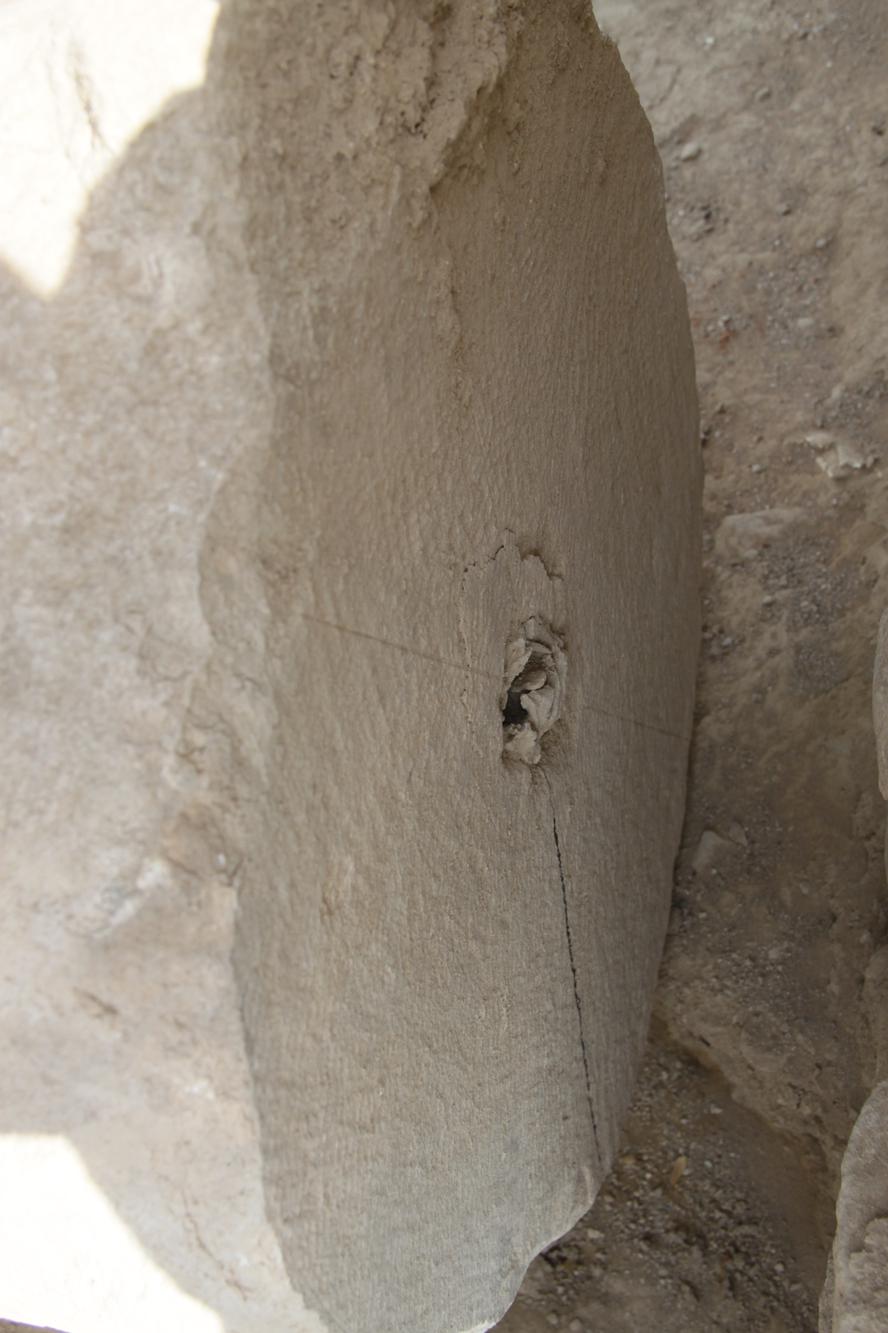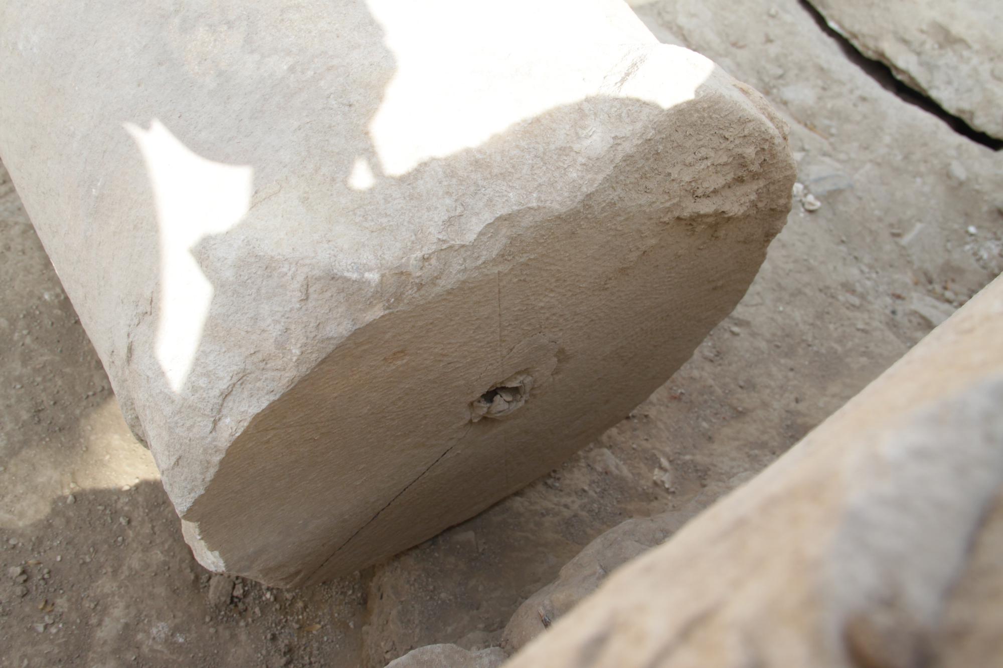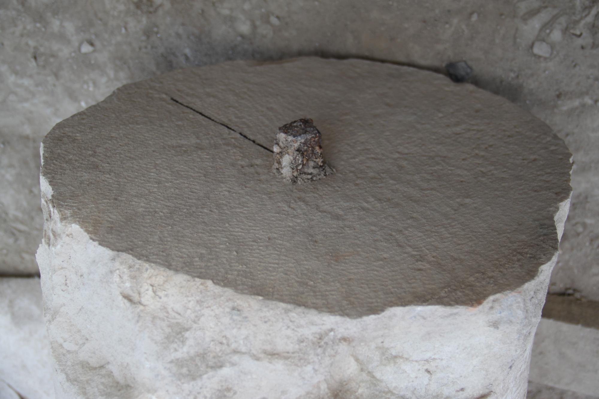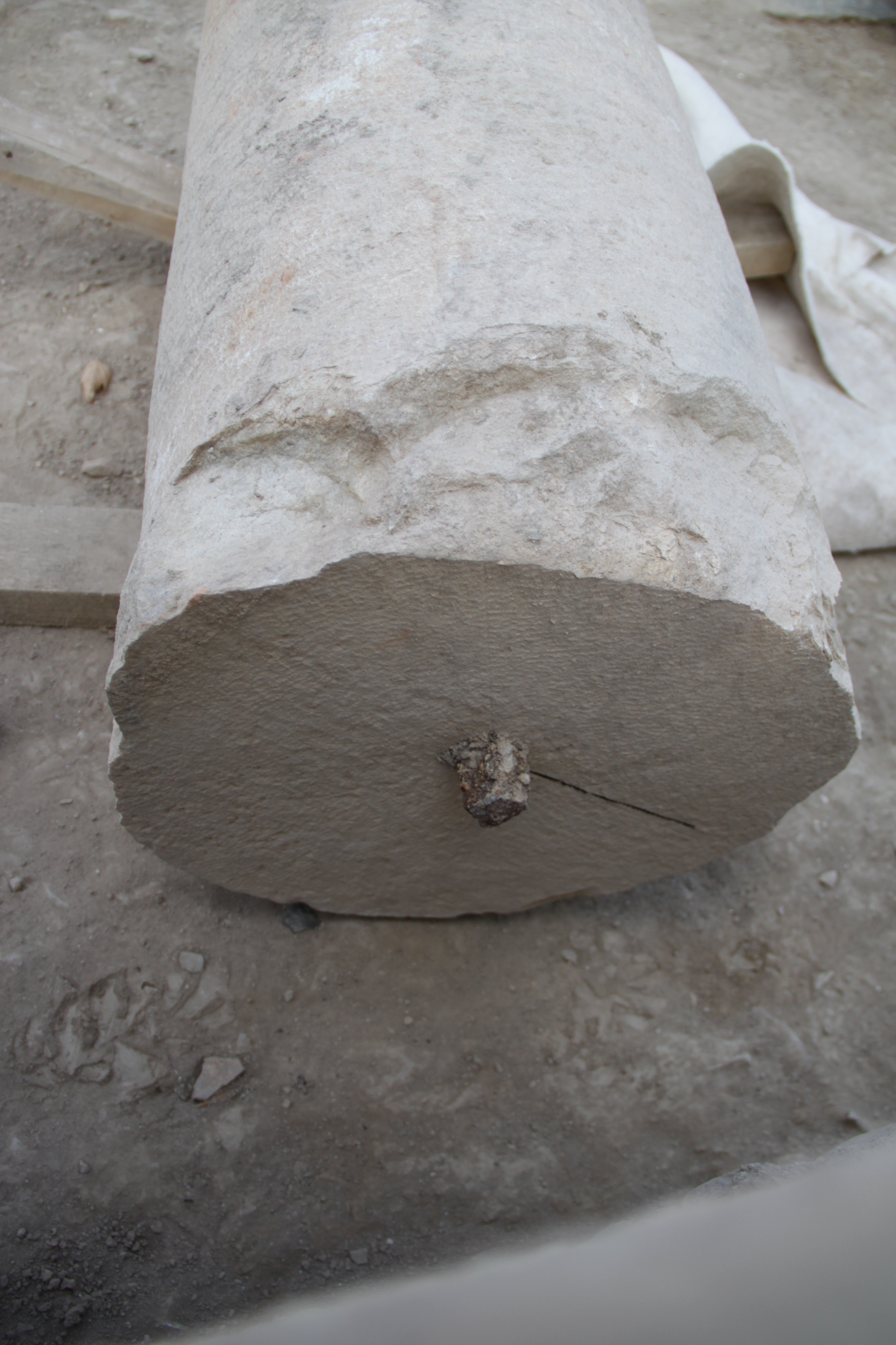 The column is a monolith preserved in two fragments. Its original dowel is still in place, measuring 4.5 x 4.5 x 3.5 cm. Four setting lines or masonry guides are incised around the dowel. Texture of the tooth chisel remain over the whole surface of the block.