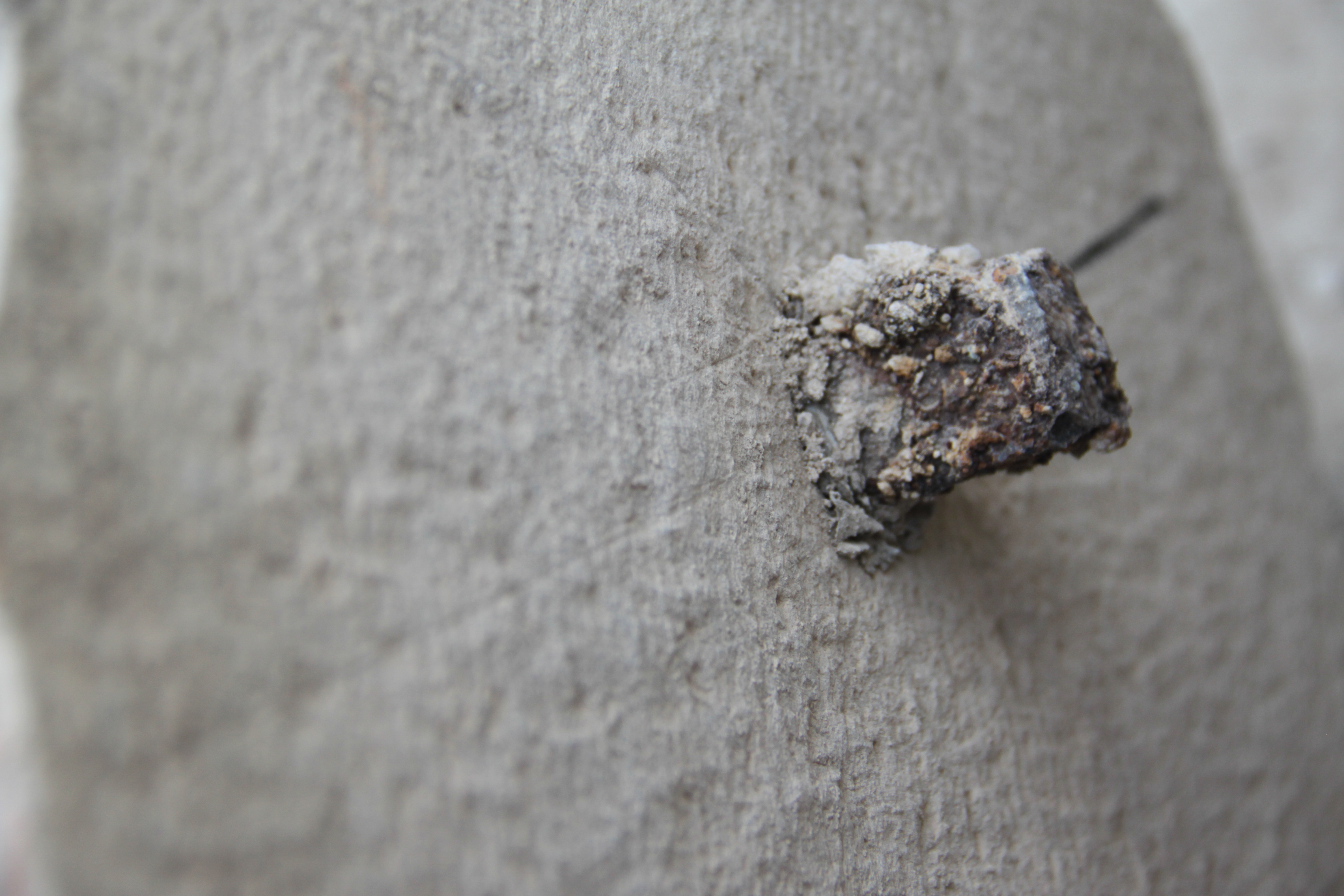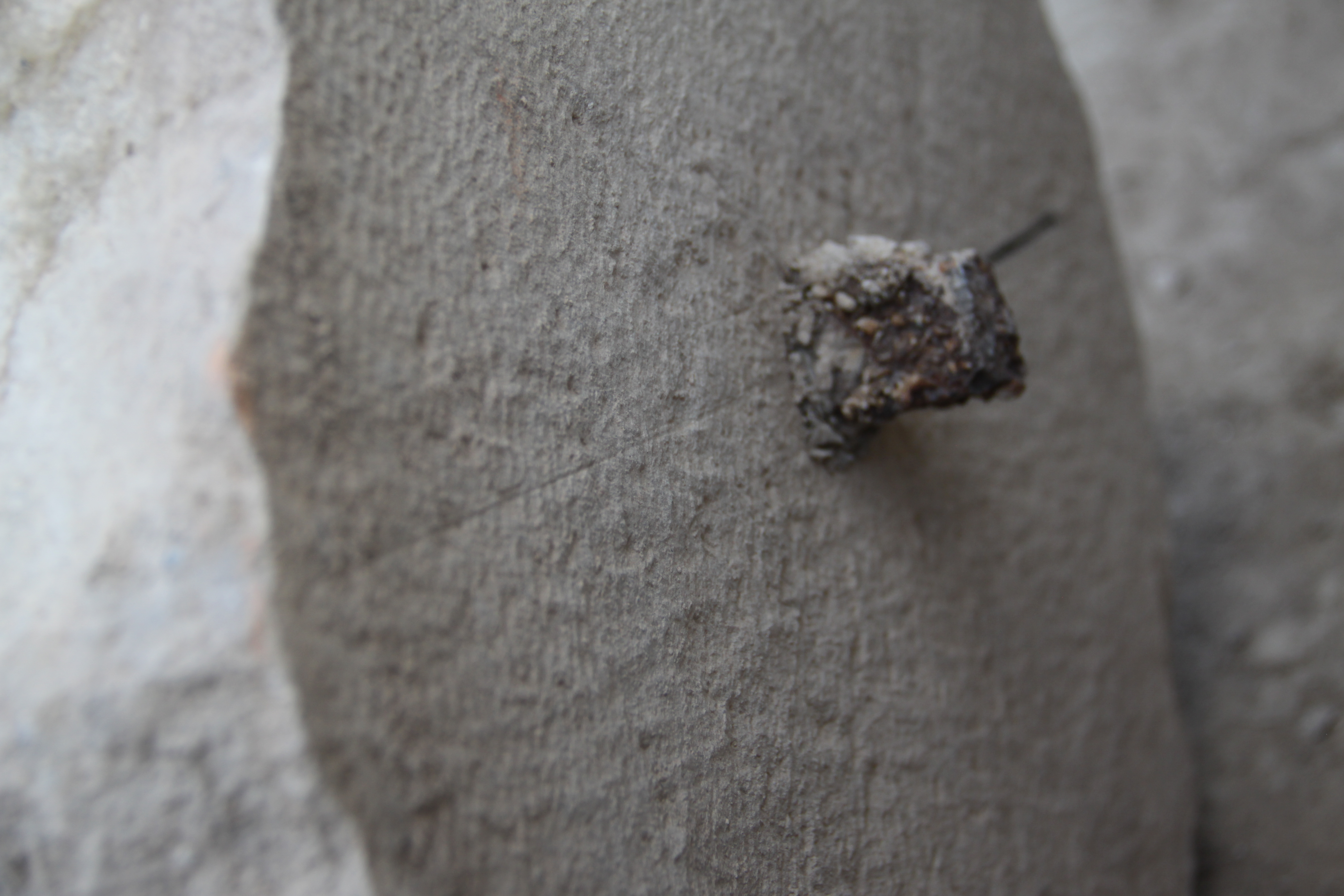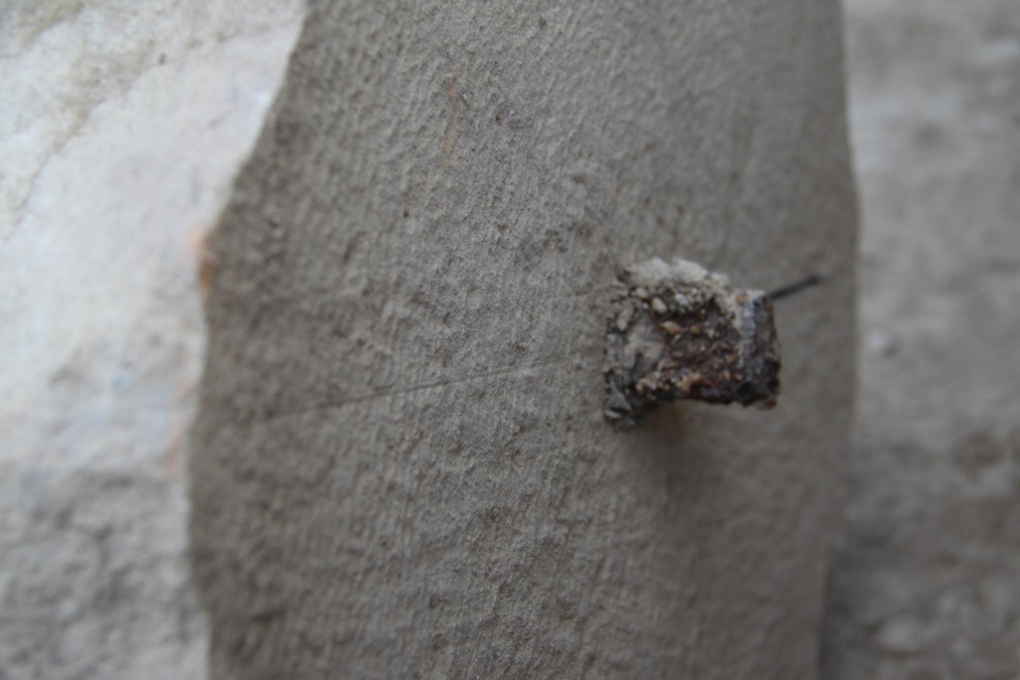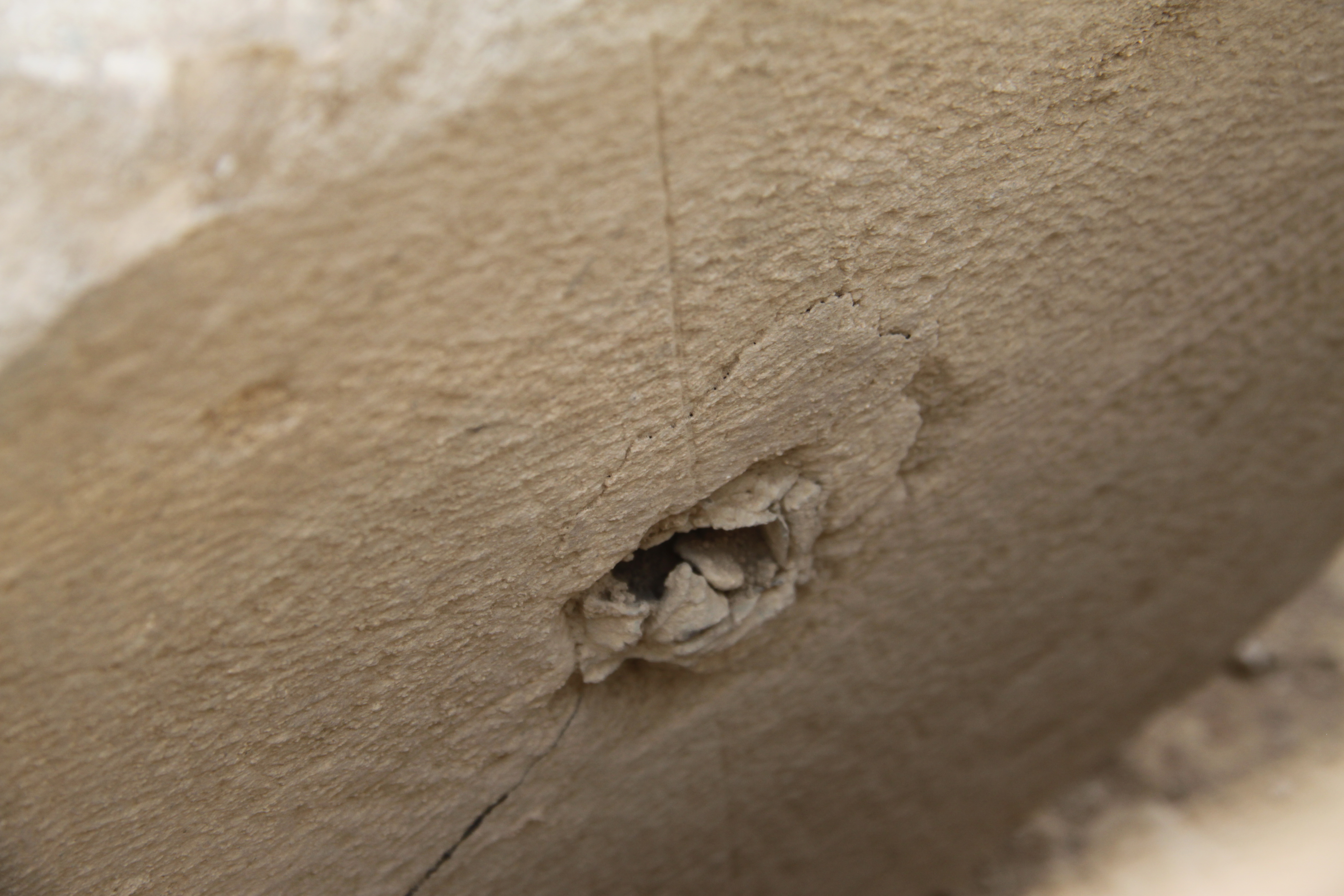 The column is a monolith preserved in two fragments. Its original dowel is still in place, measuring 4.5 x 4.5 x 3.5 cm. Four setting lines or masonry guides are incised around the dowel. Texture of the tooth chisel remain over the whole surface of the block.