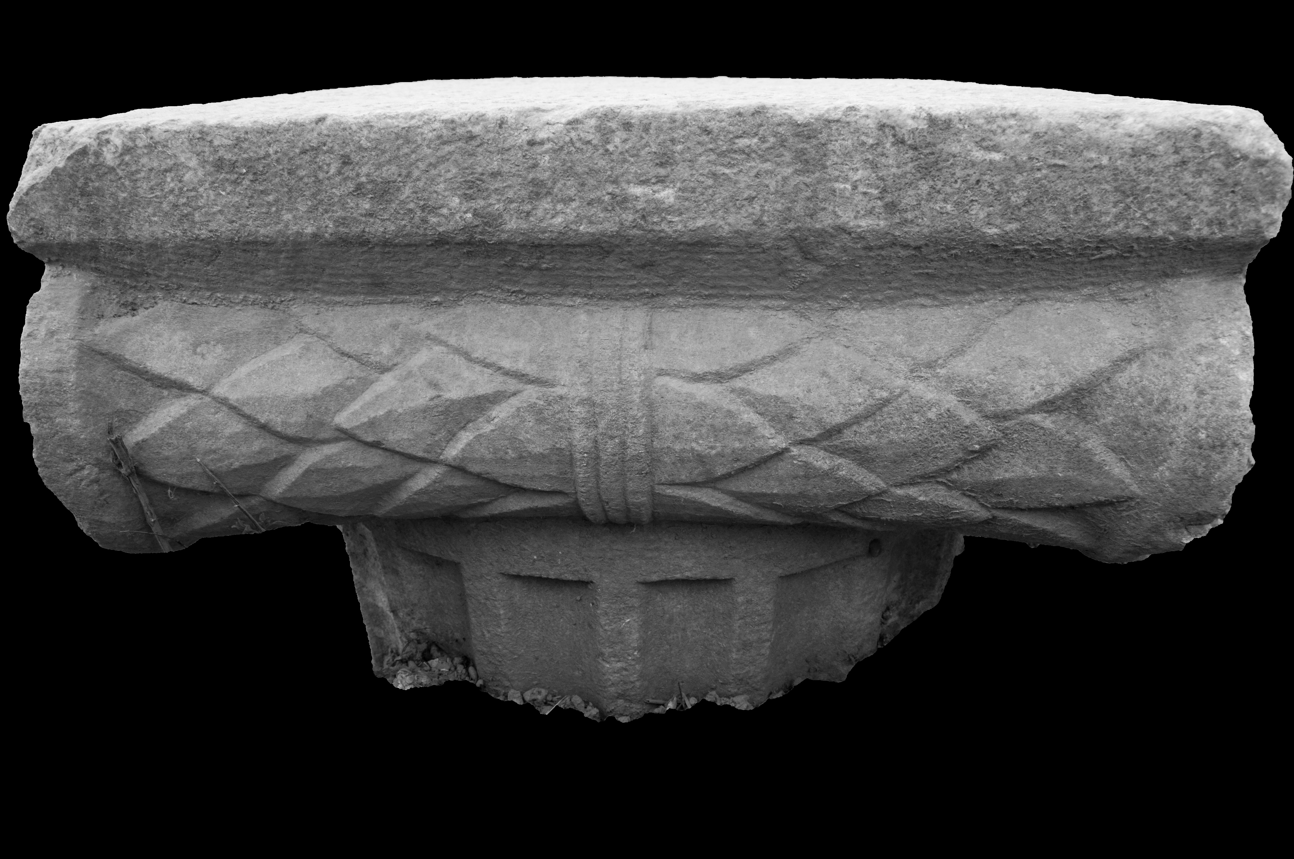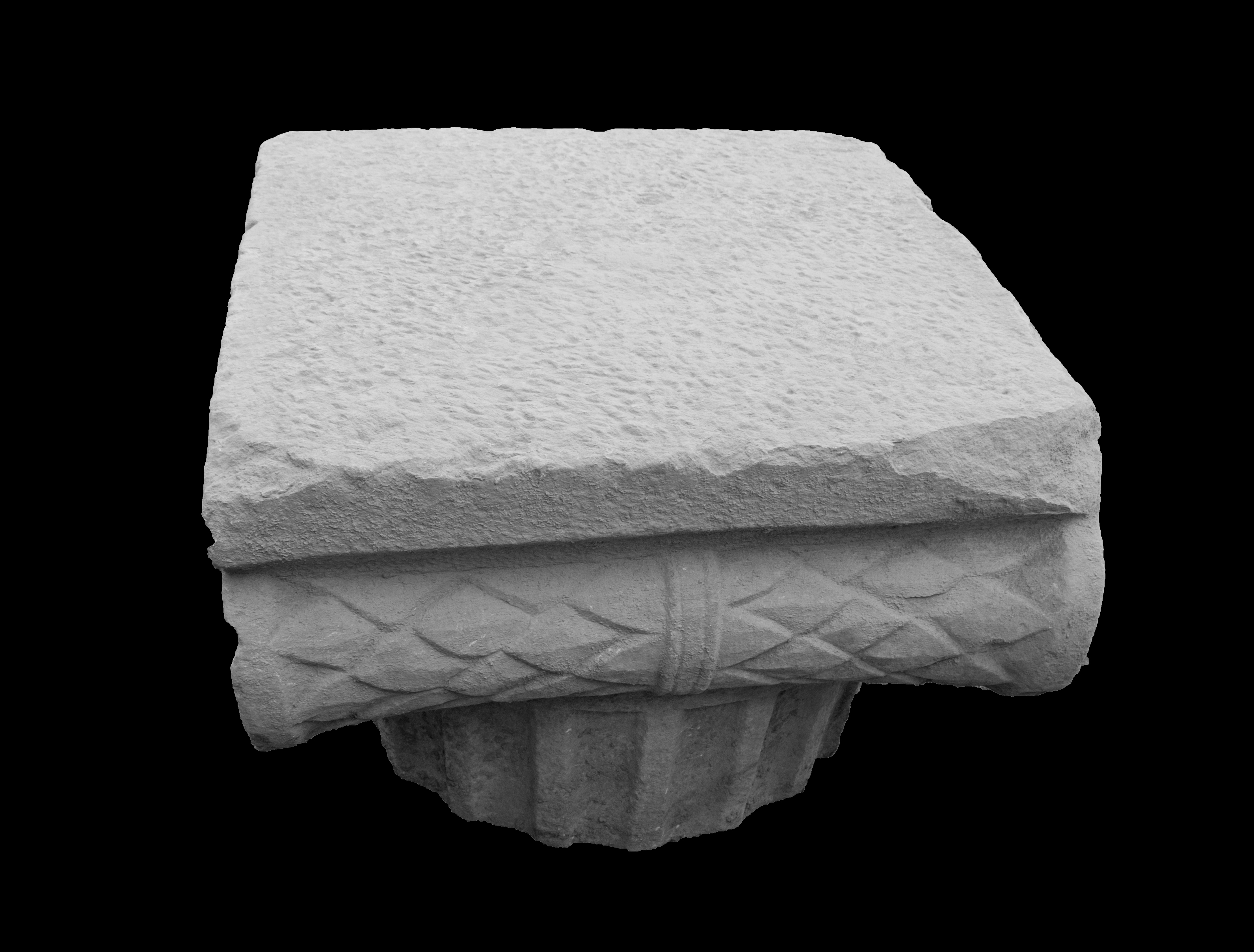Abacus undecorated. Egg and dart pattern across echinus; one side consists of three eggs and two darts with bead and reel below, on the other side a single large egg with two darts; a moulded border delineates the eggs and the darts point upward. Volutes turn three to four times. Scale-like leaf pattern on the bolster, in the manner of SE2c, SE3c, SE5c–SE7c, SE13c, SE15c, SE17c and SE18c. Balteus consists of three flat bands of astragal moulding, similar to SE3c–SE5c and SE7c.