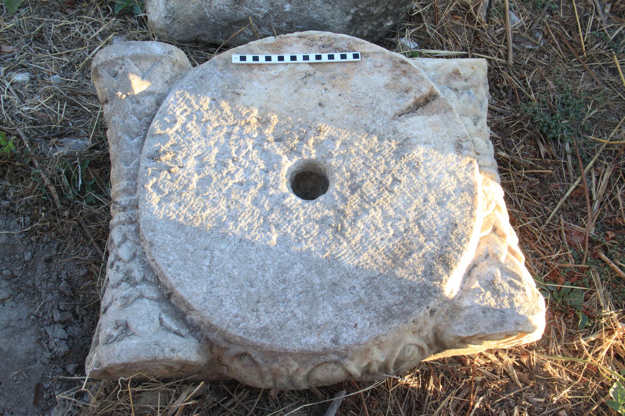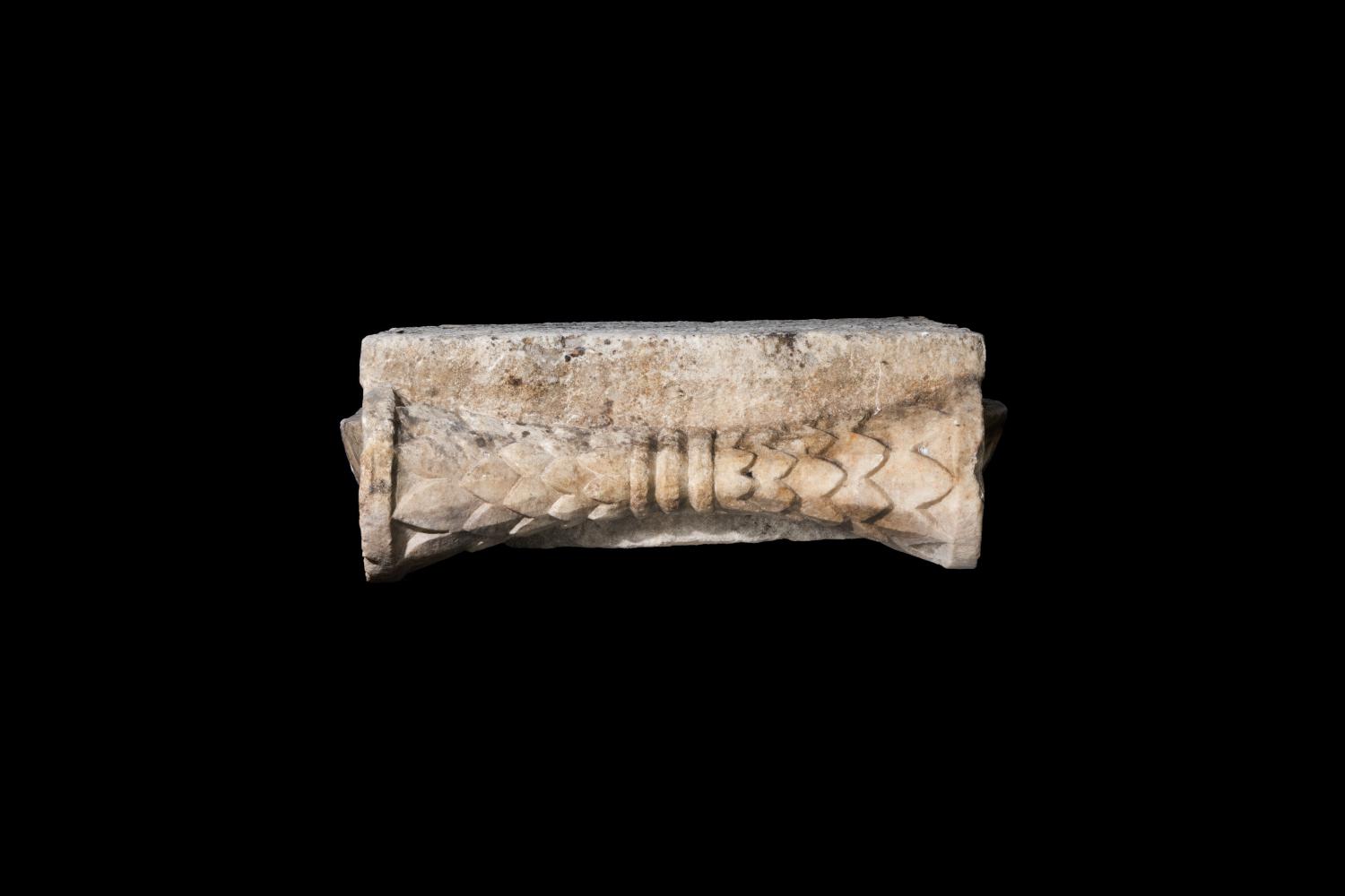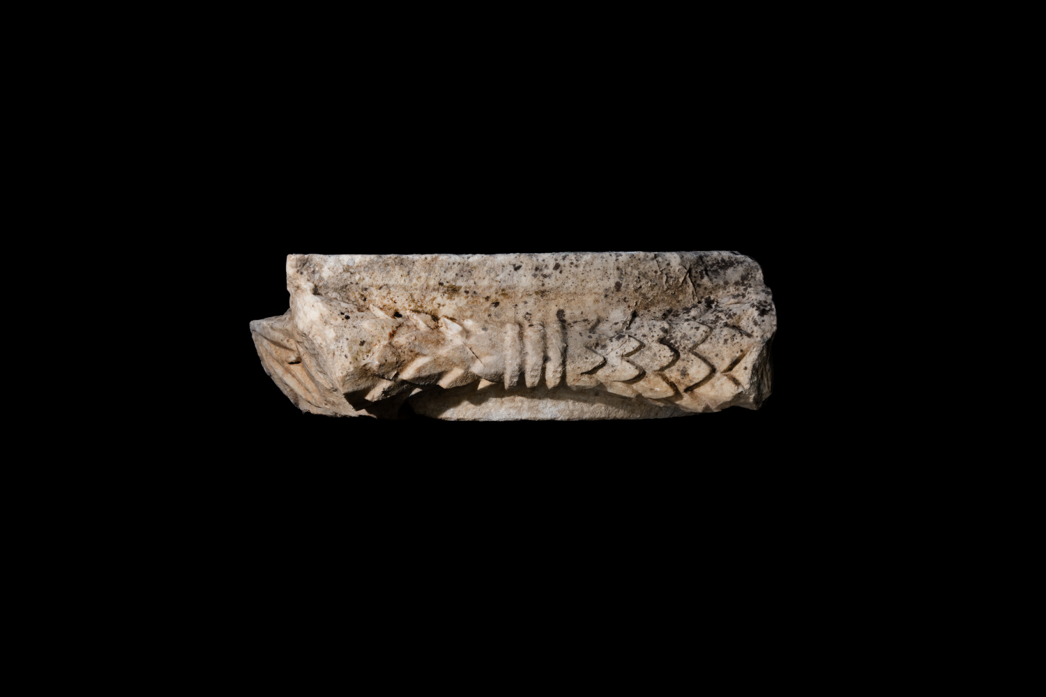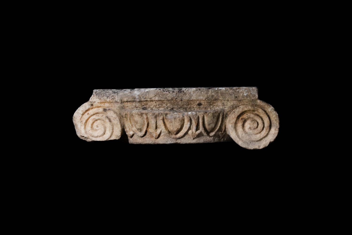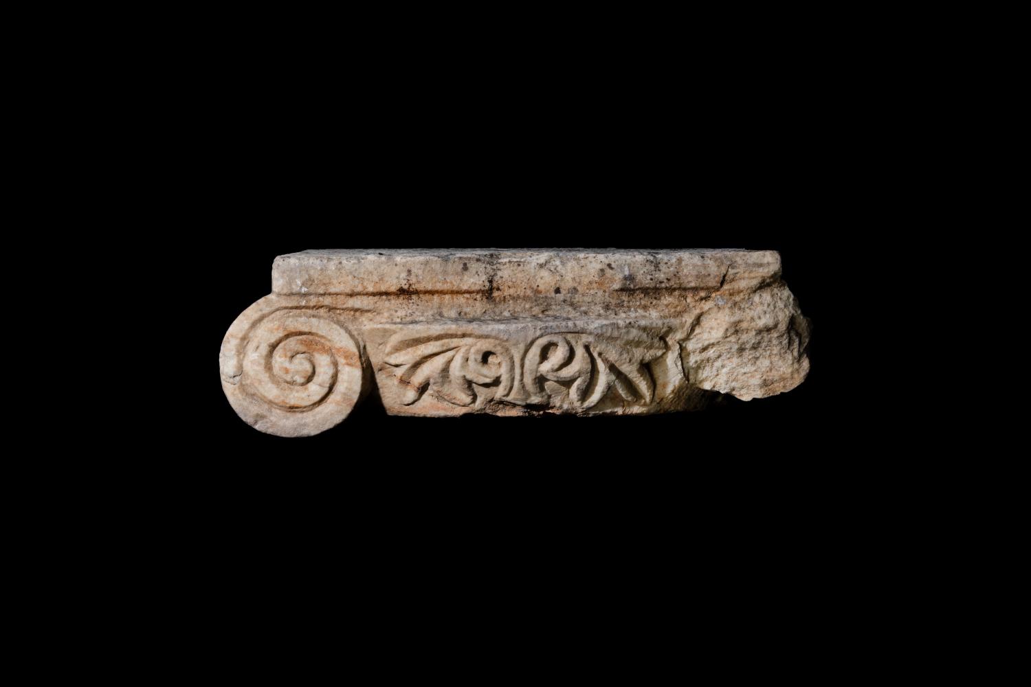 - Nearly complete capital in white marble; missing a single volute with some damage on others. Dowel hole preserved below. Circular dowel hole in the centre bottom, Dia.: 6.0, D: 7.3.