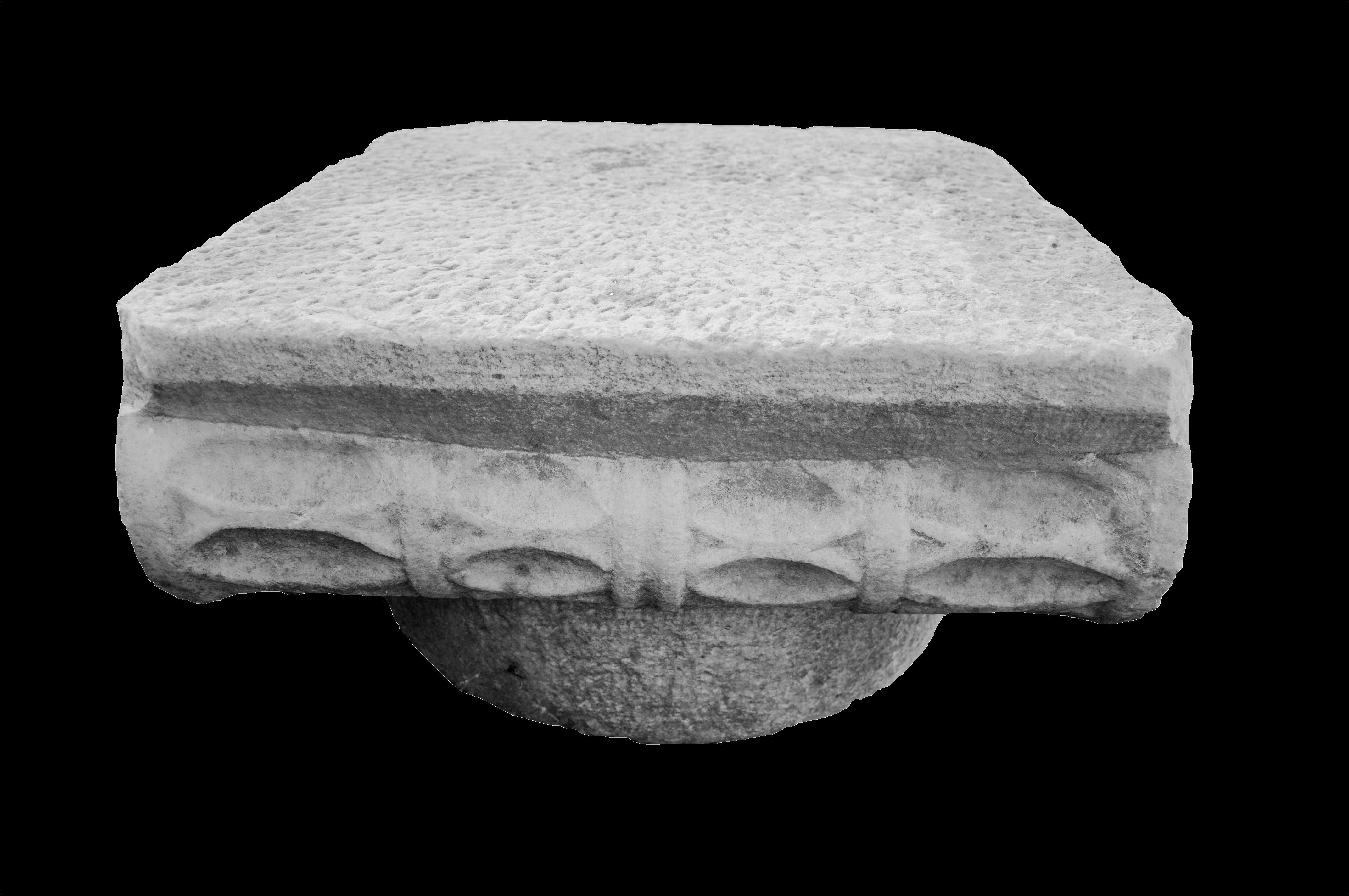 - Complete capital in white marble, with portion of fluted column drum and dowel hole preserved below. Minor wear to the abacus. Circular dowel hole in centre bottom, Dia.: 4.0, D: 4.0.
