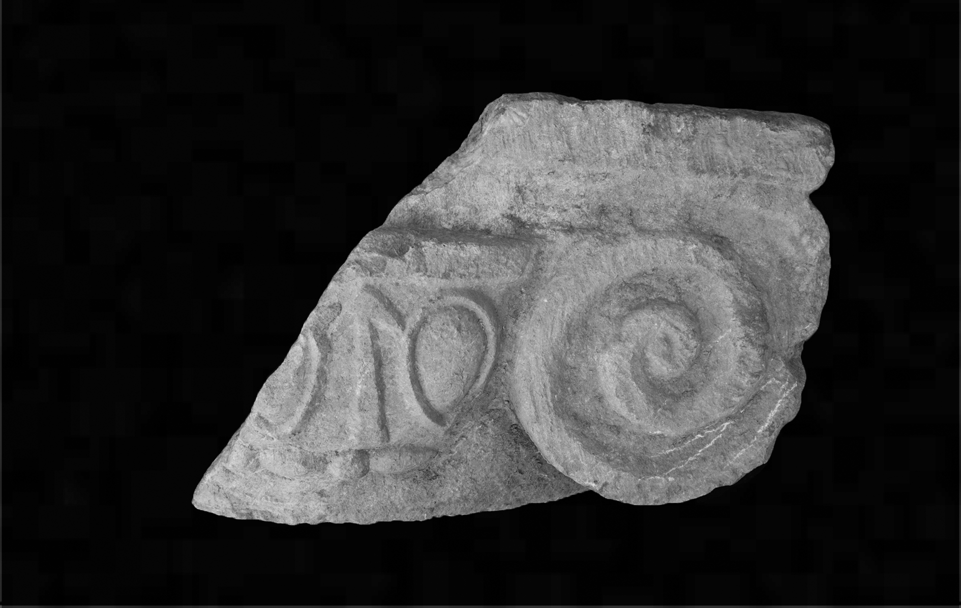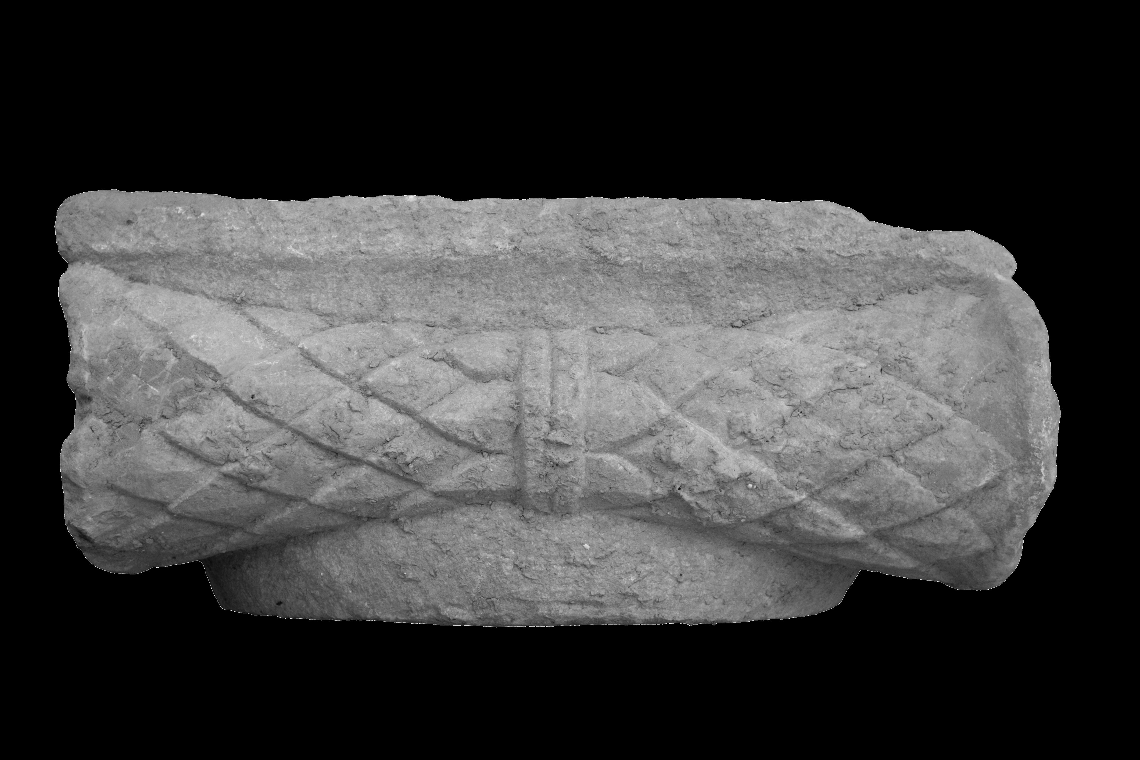 - Fragment in blue-grey marble, with approximately half of the capital re- maining and dowel hole preserved below. Circular dowel hole in center bottom, Dia.: 3.9, D: 4.1.