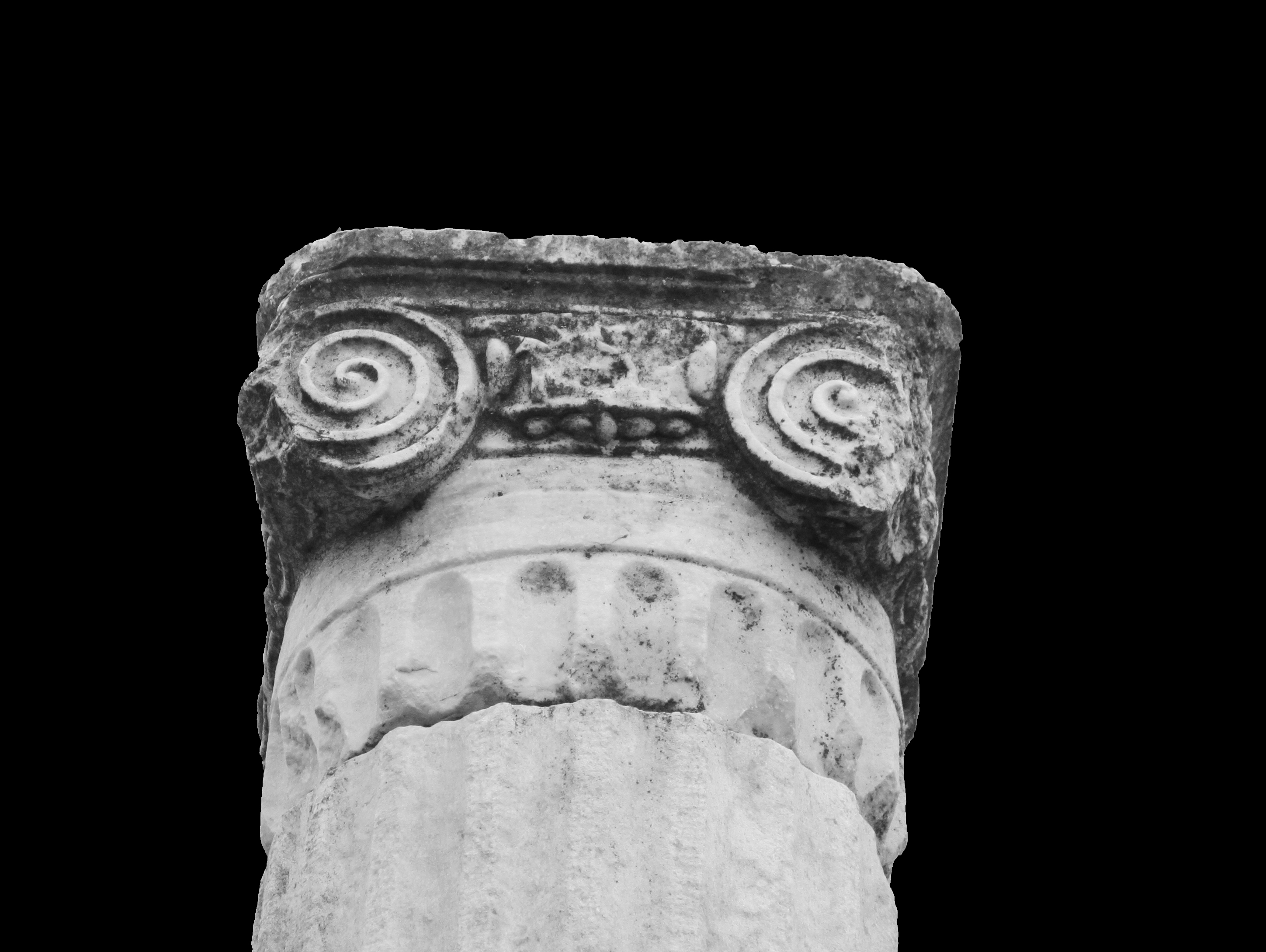 - Complete capital, with a portion of fluted column drum preserved below; heavy damage to the echinus on both sides and edges of the volutes. Cut from a reused block, possibly a millstone, as demonstrated by a circular channel cut on top with large boss in the centre. Currently re-erected in the South Stoa on the first restored column from the East Gate; measurements unavailable.