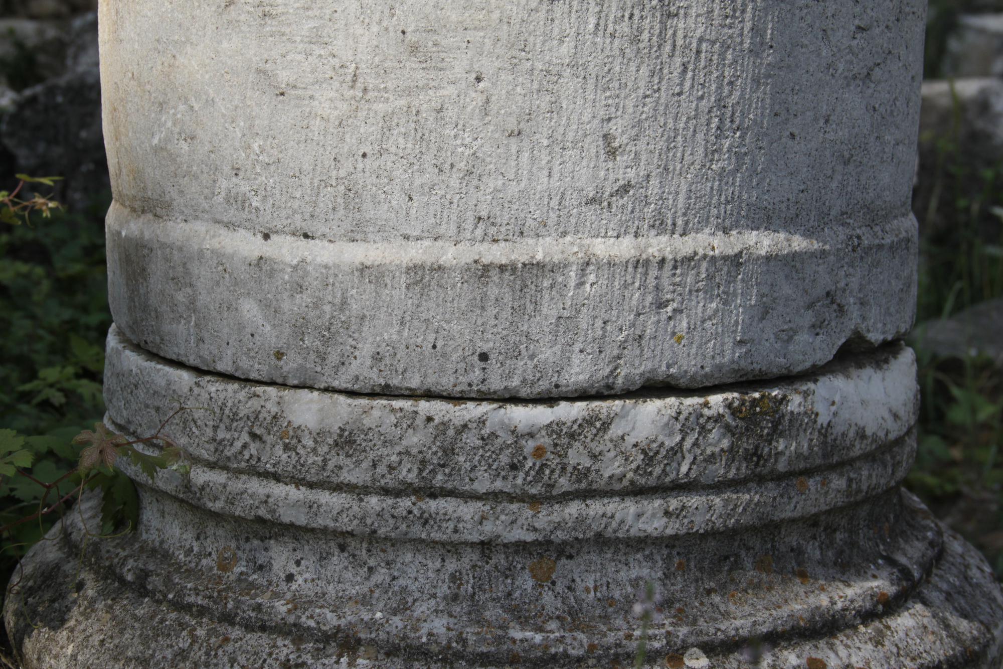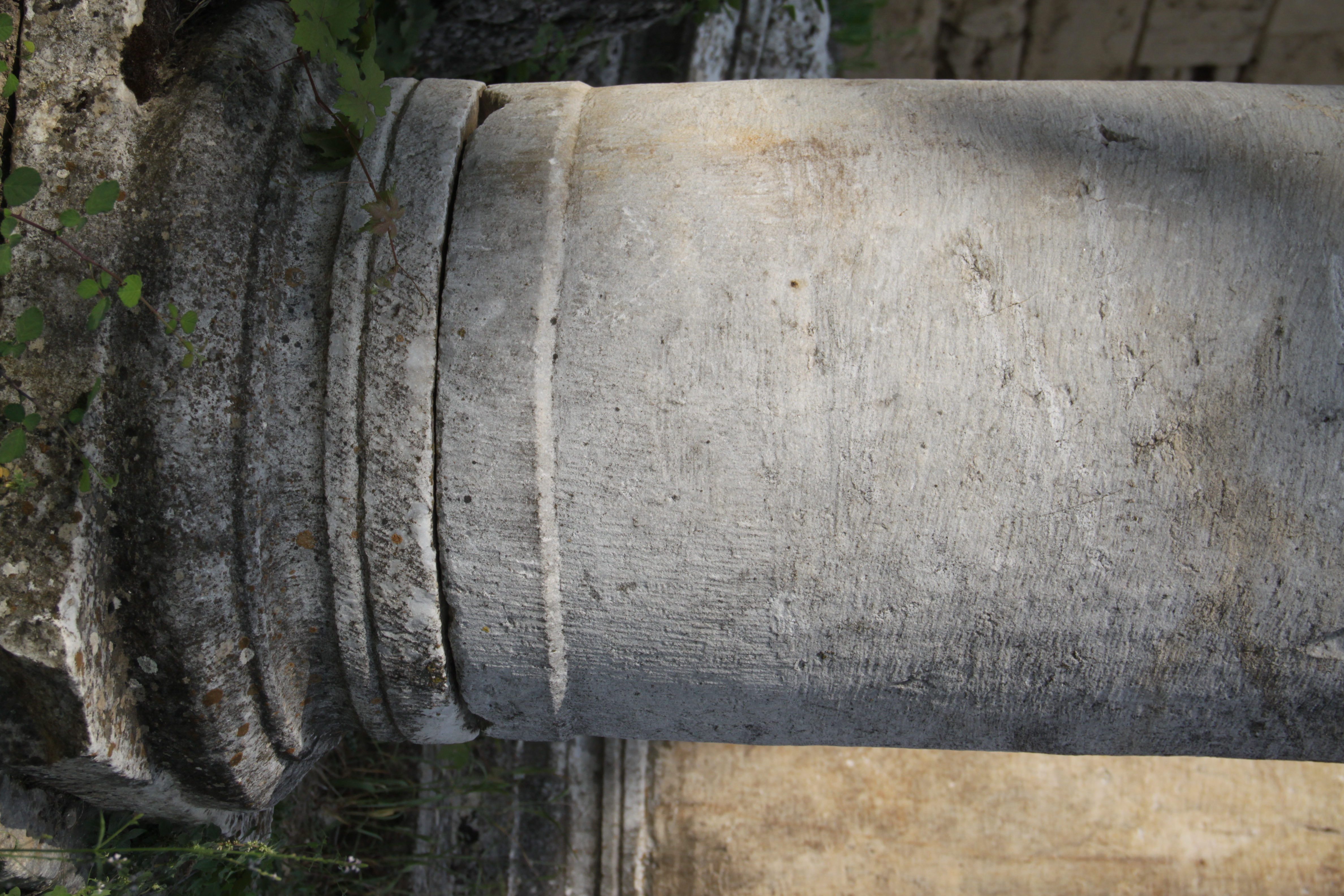 Partially fluted; composed of three drums. The second drum is partially fluted, with fillets that end in a u-shaped moulding. Cuttings for hanging a device of some sort can be found 0.18 cm up the third drum.