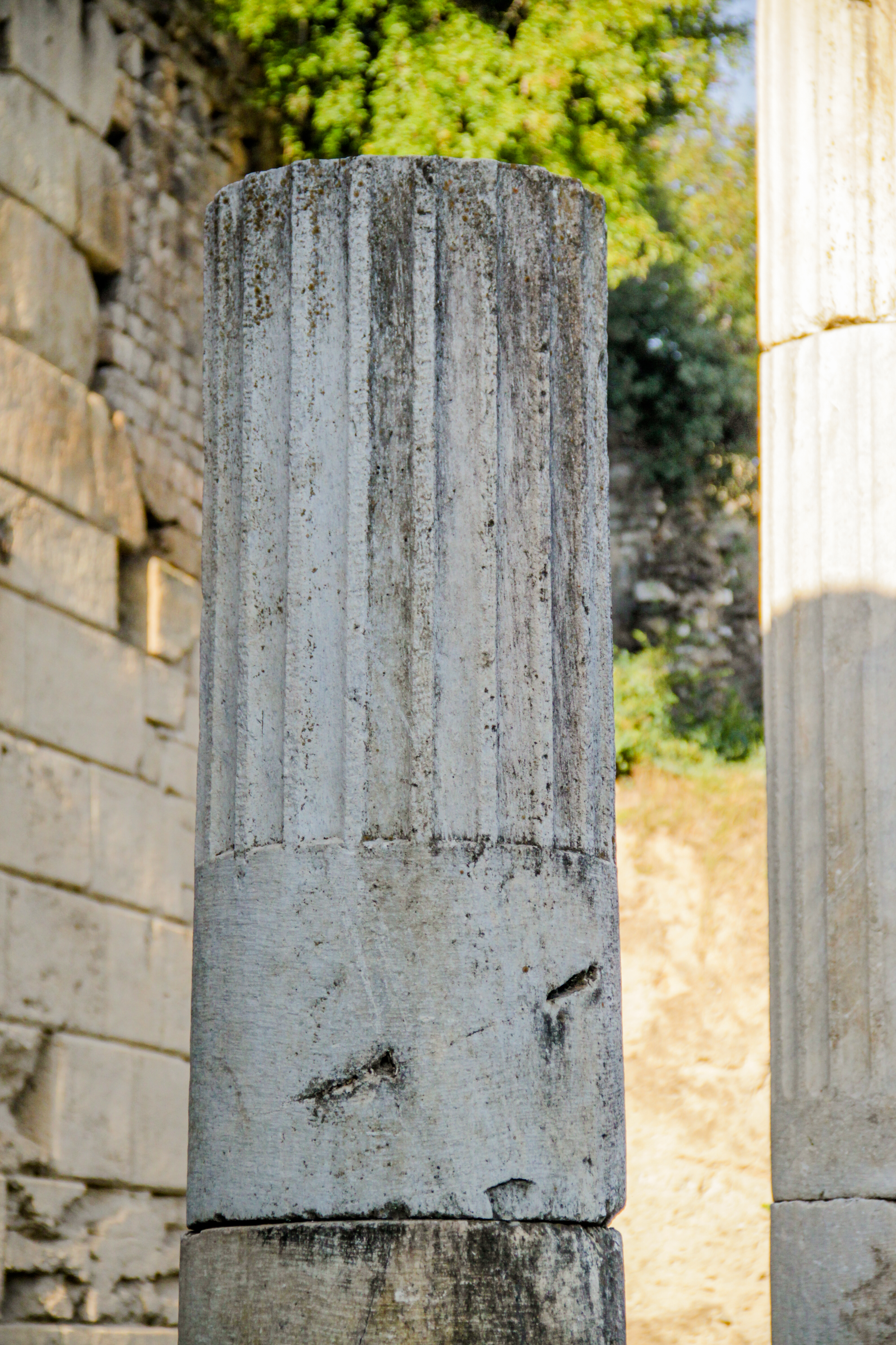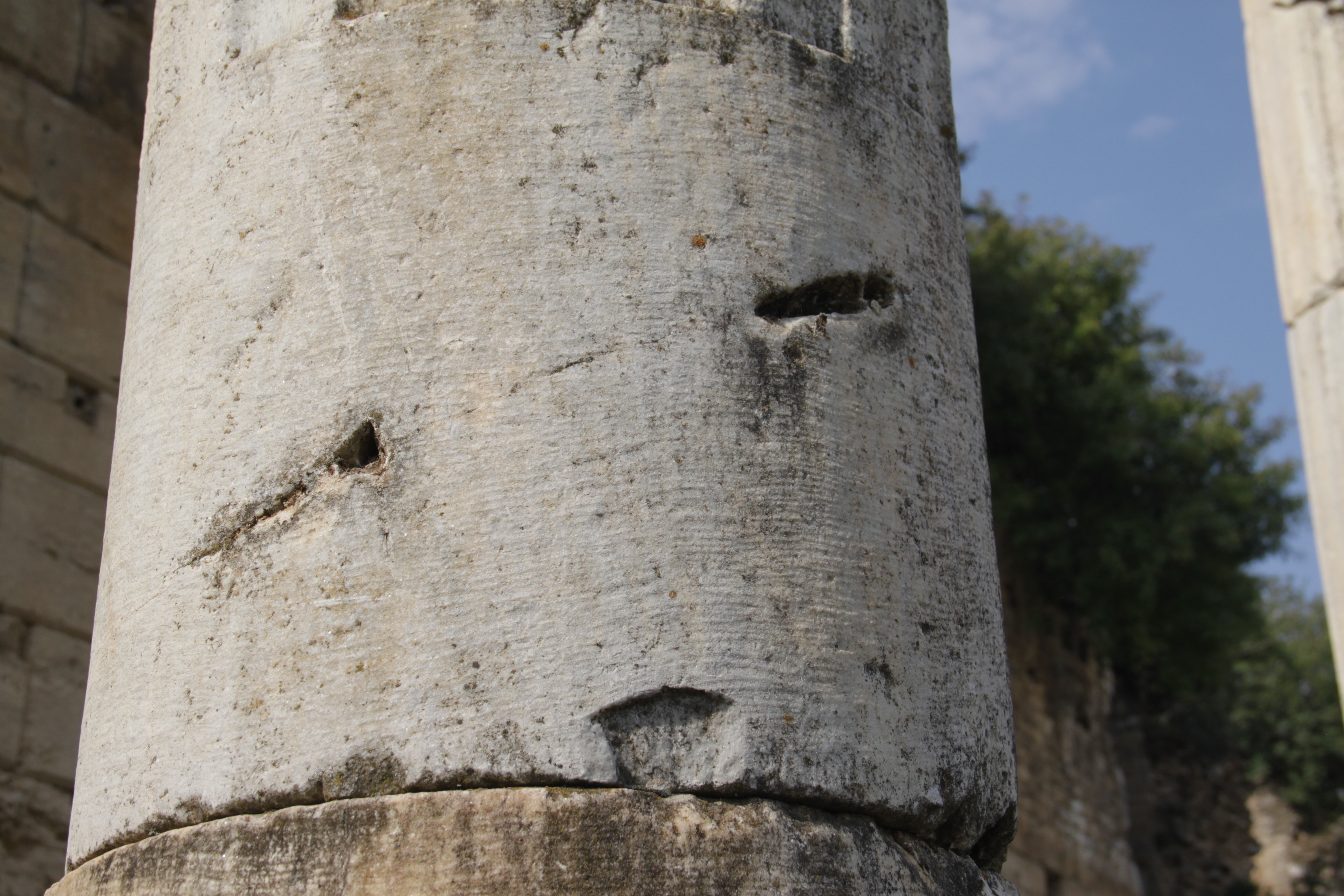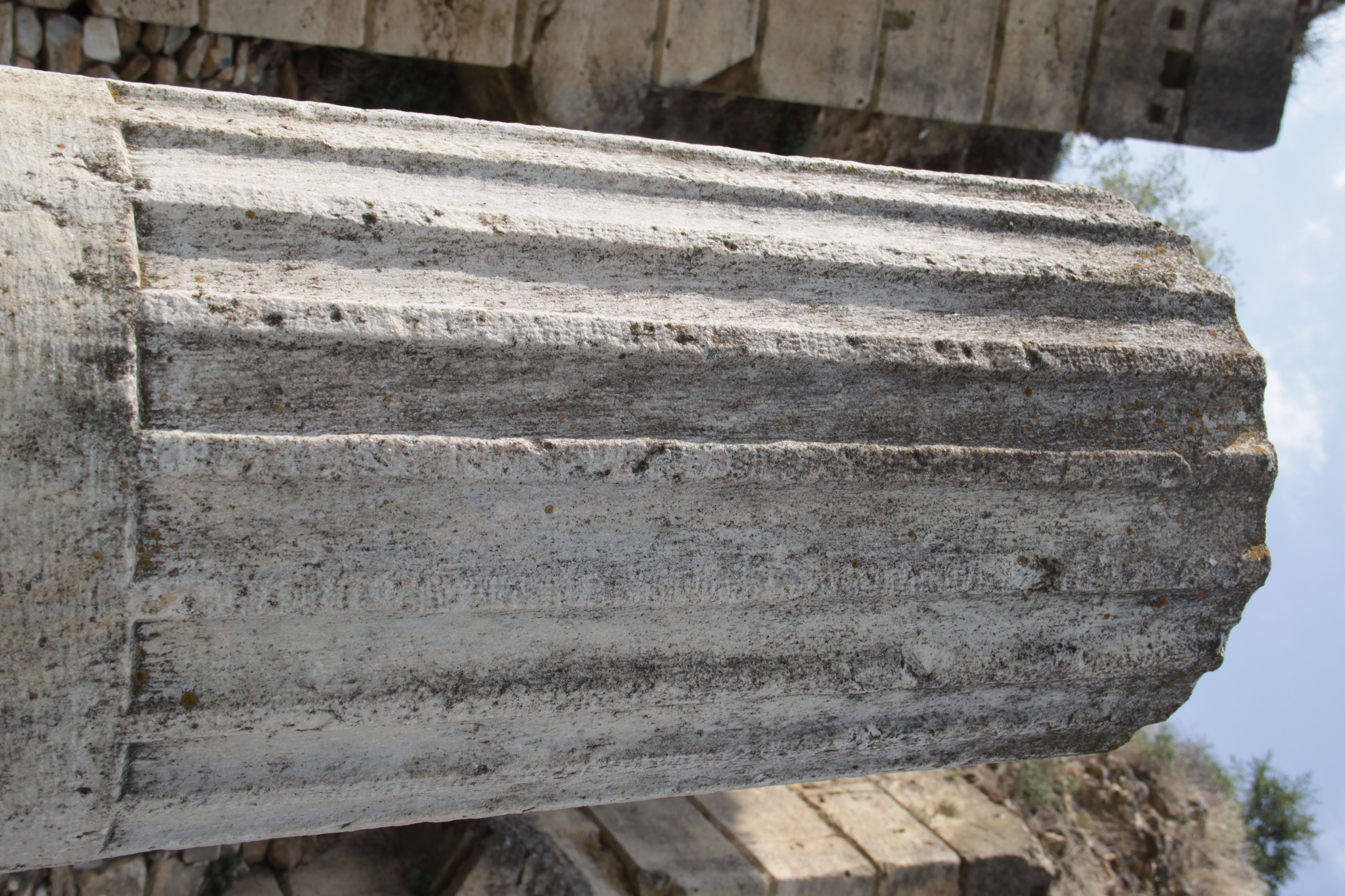 Partially fluted; composed of several drums, two of which remain. The second drum is partially fluted, with fillets that end in a pi-shaped moulding.