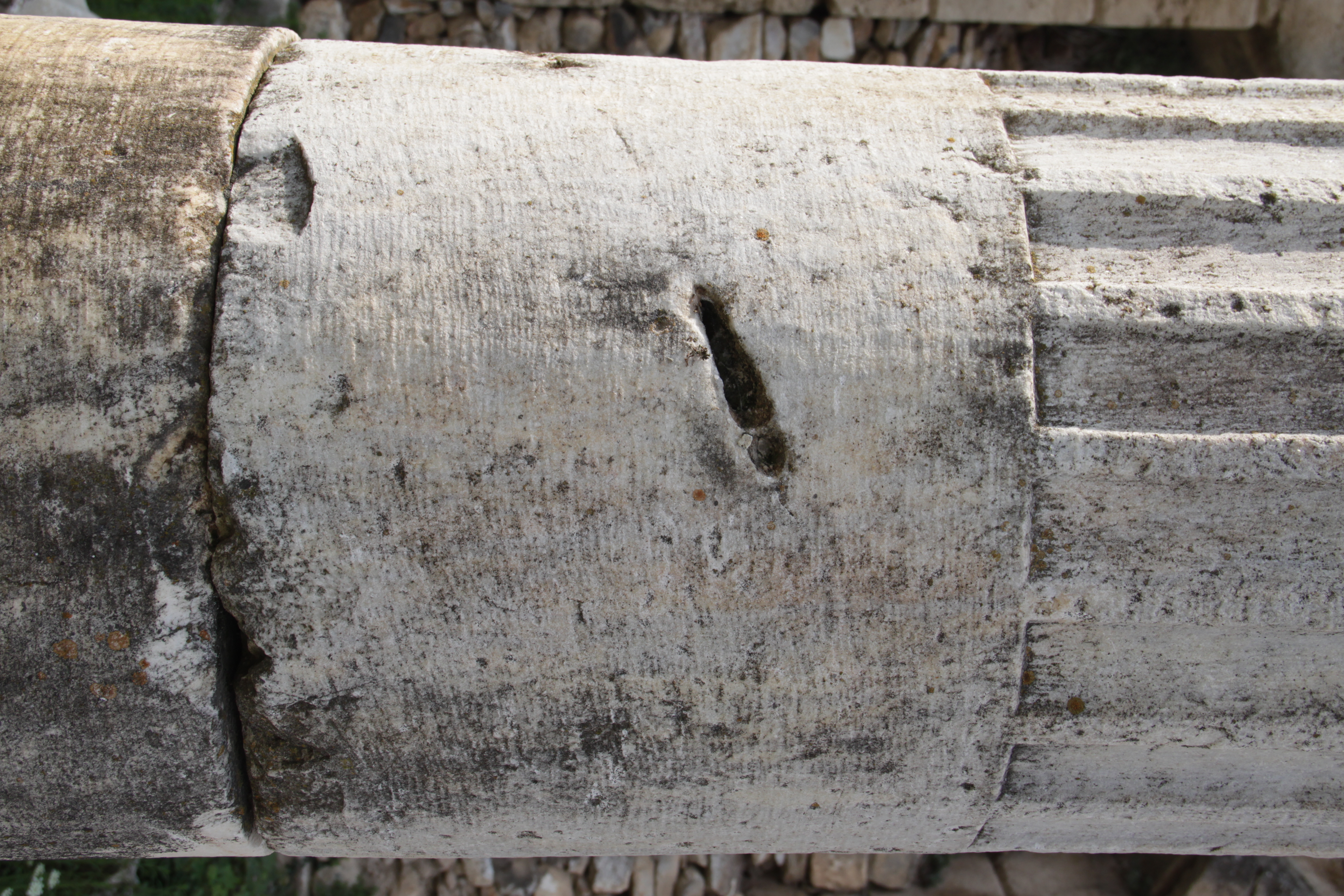 Over the unfluted sections of both drums, evidence of the tooth chisel remains as a prominent surface texture over the whole of the block, with its strokes applied in short horizontal lines. On the fluted portion of the second drum, within the fillets and on the flutes, the strokes of the tooth chisel run vertically.