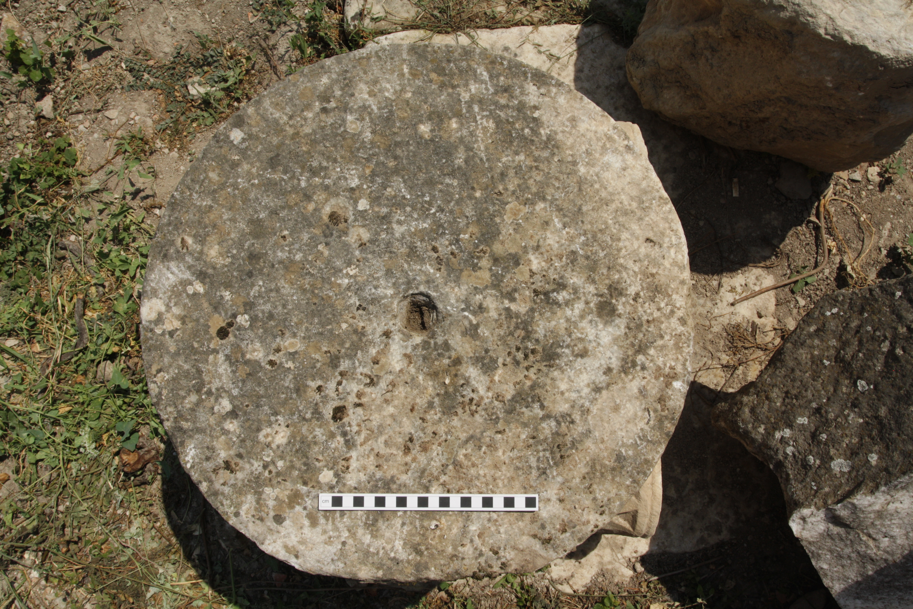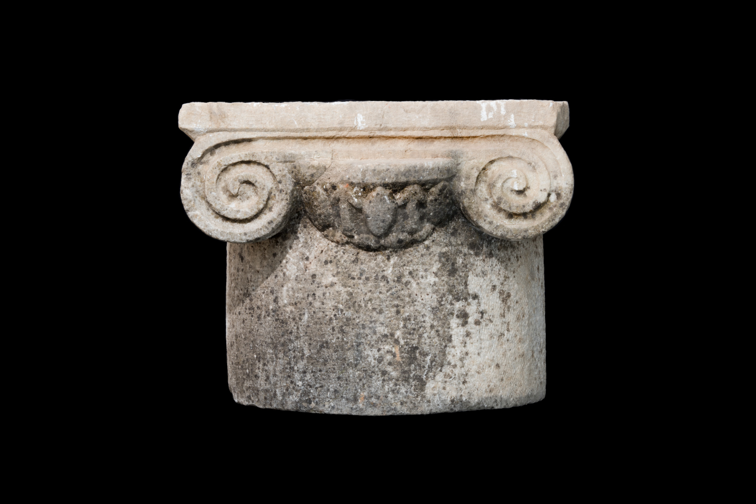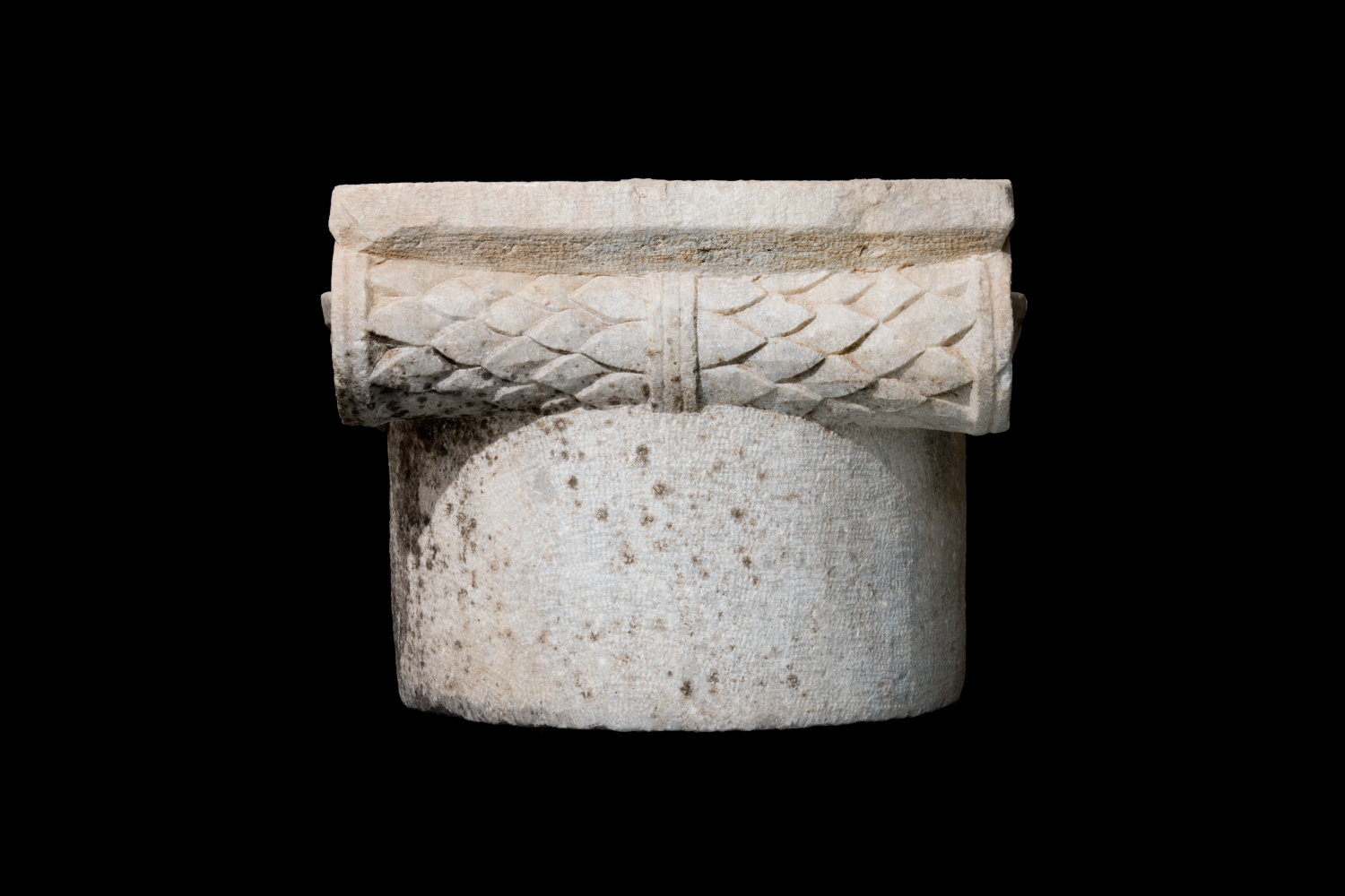 - Complete capital in white marble, with a portion of the unfluted column drum shaft and dowel hole preserved below.