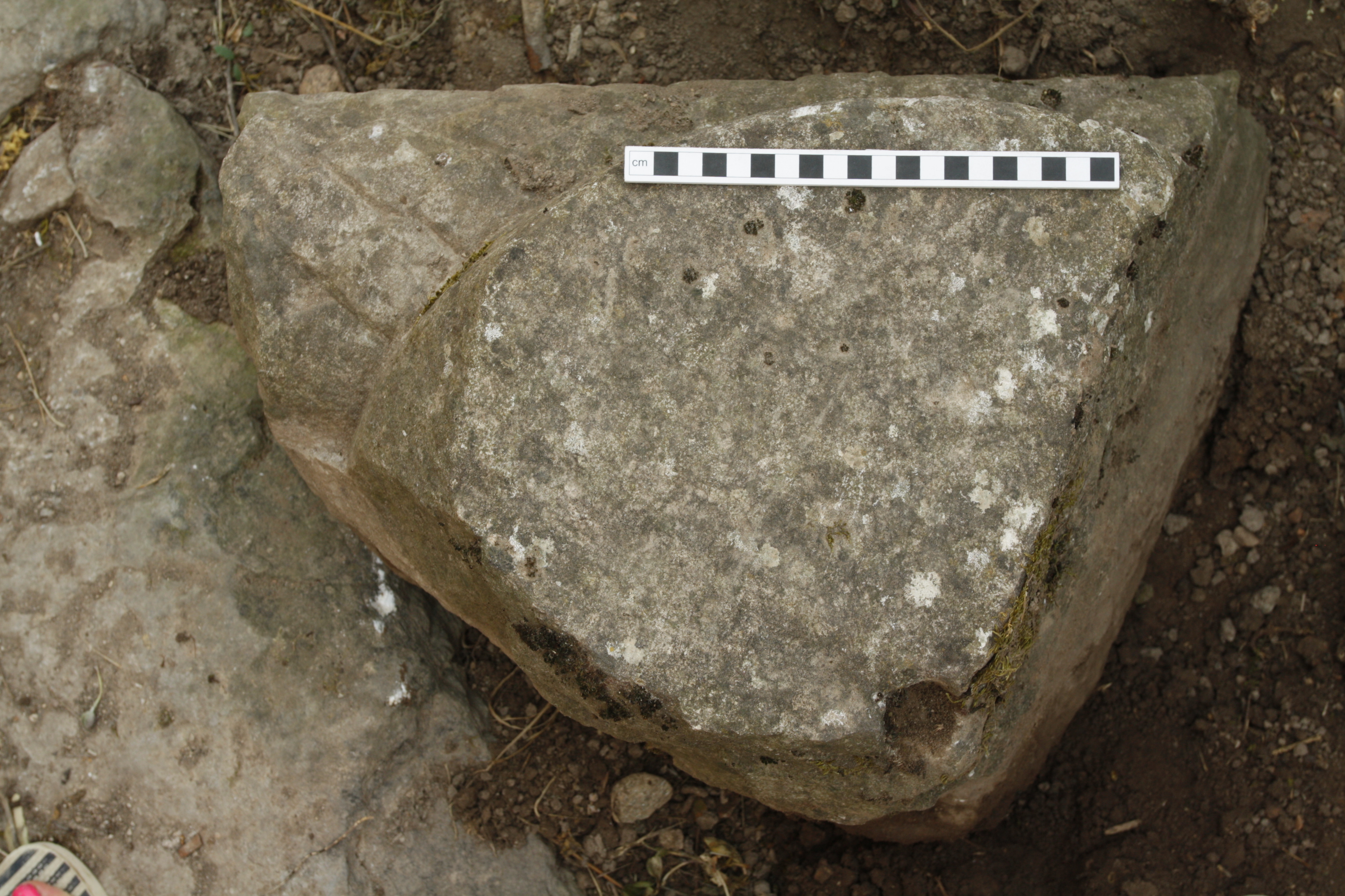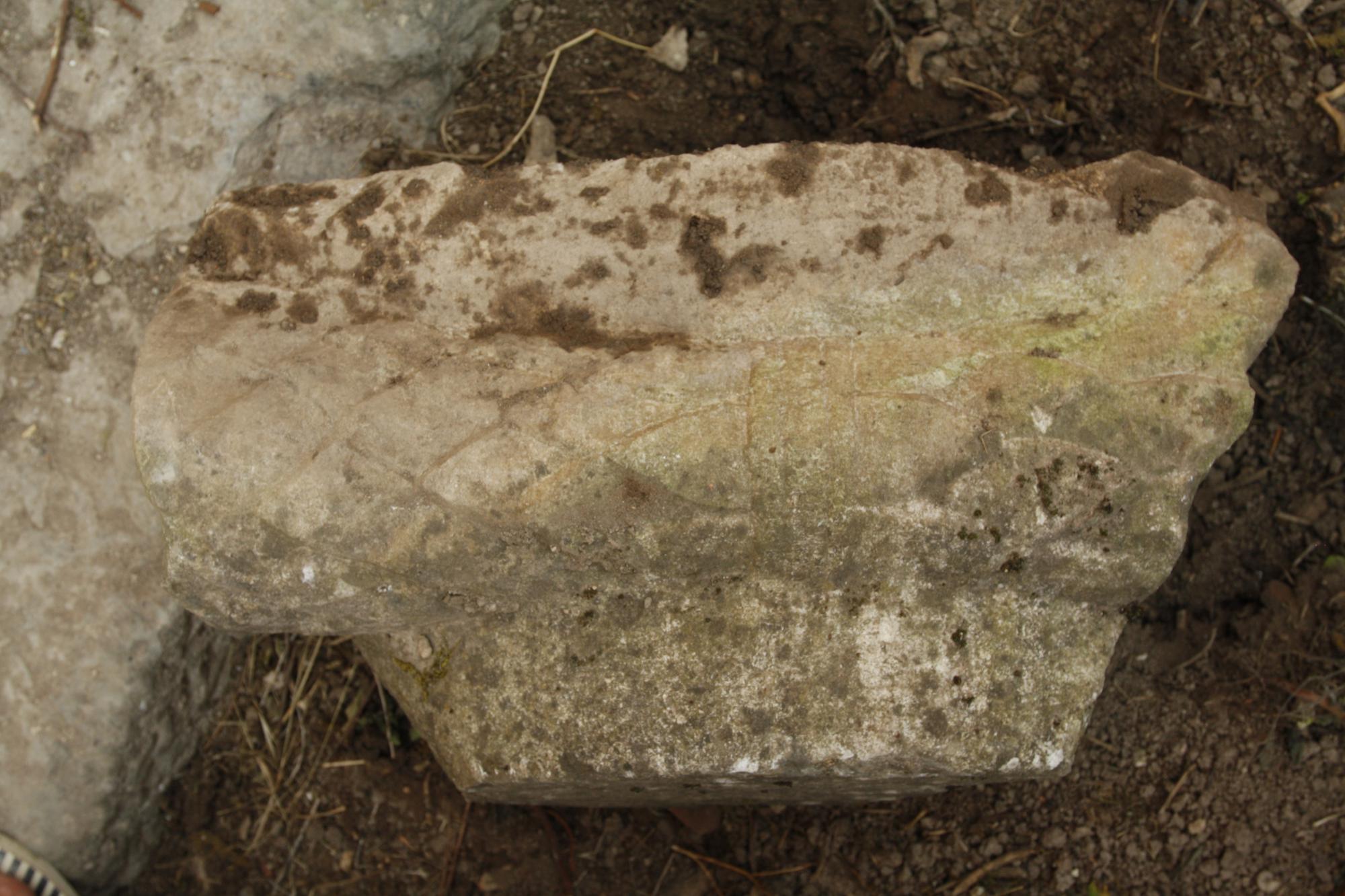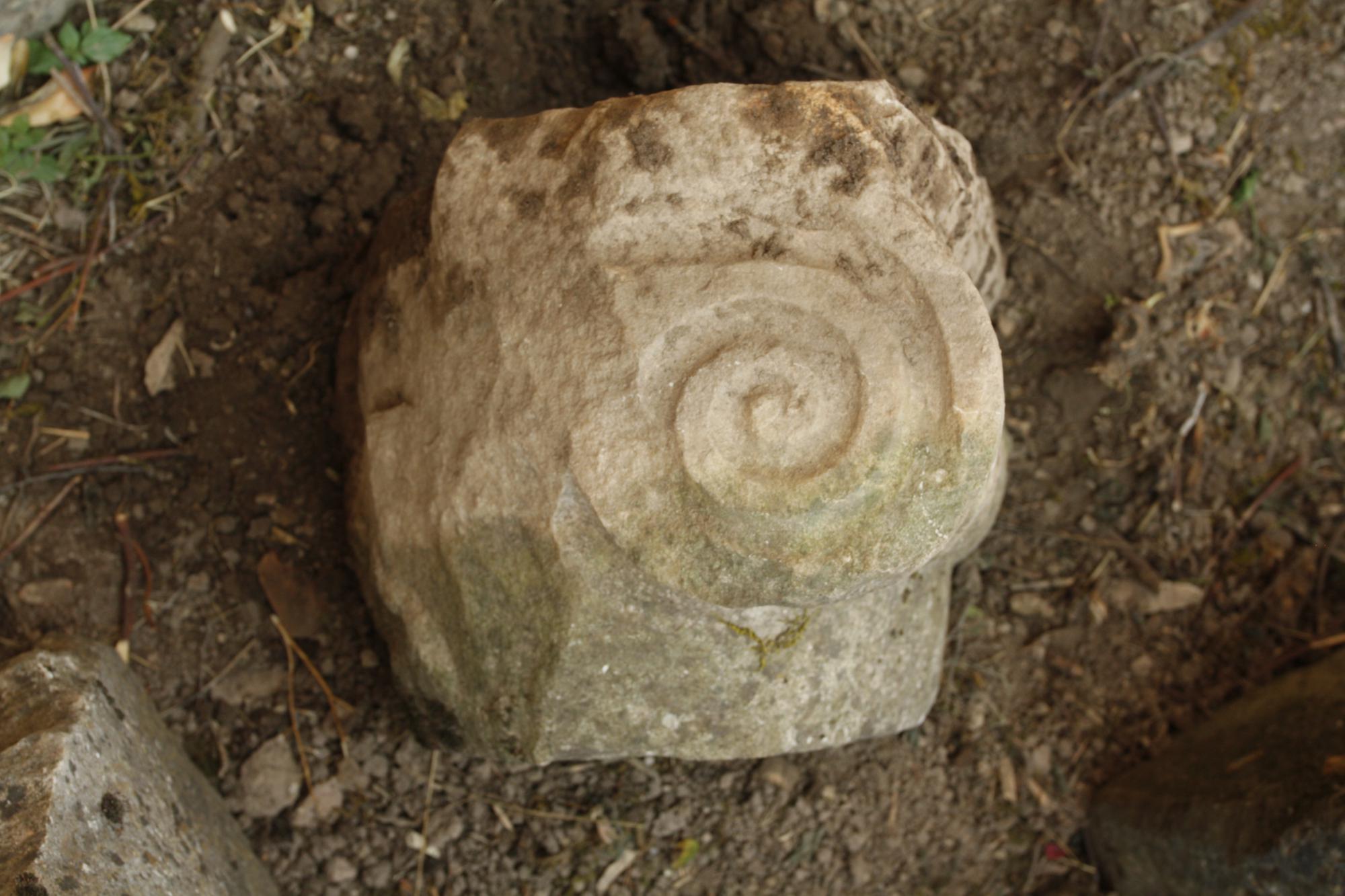 - Small fragment, with one volute and most of a single bolster preserved; a portion of the unfluted column drum shaft and partial dowel hole below; no echinus remains on either side. Circular dowel hole in the centre bottom, no visible lead: D: 4.3.