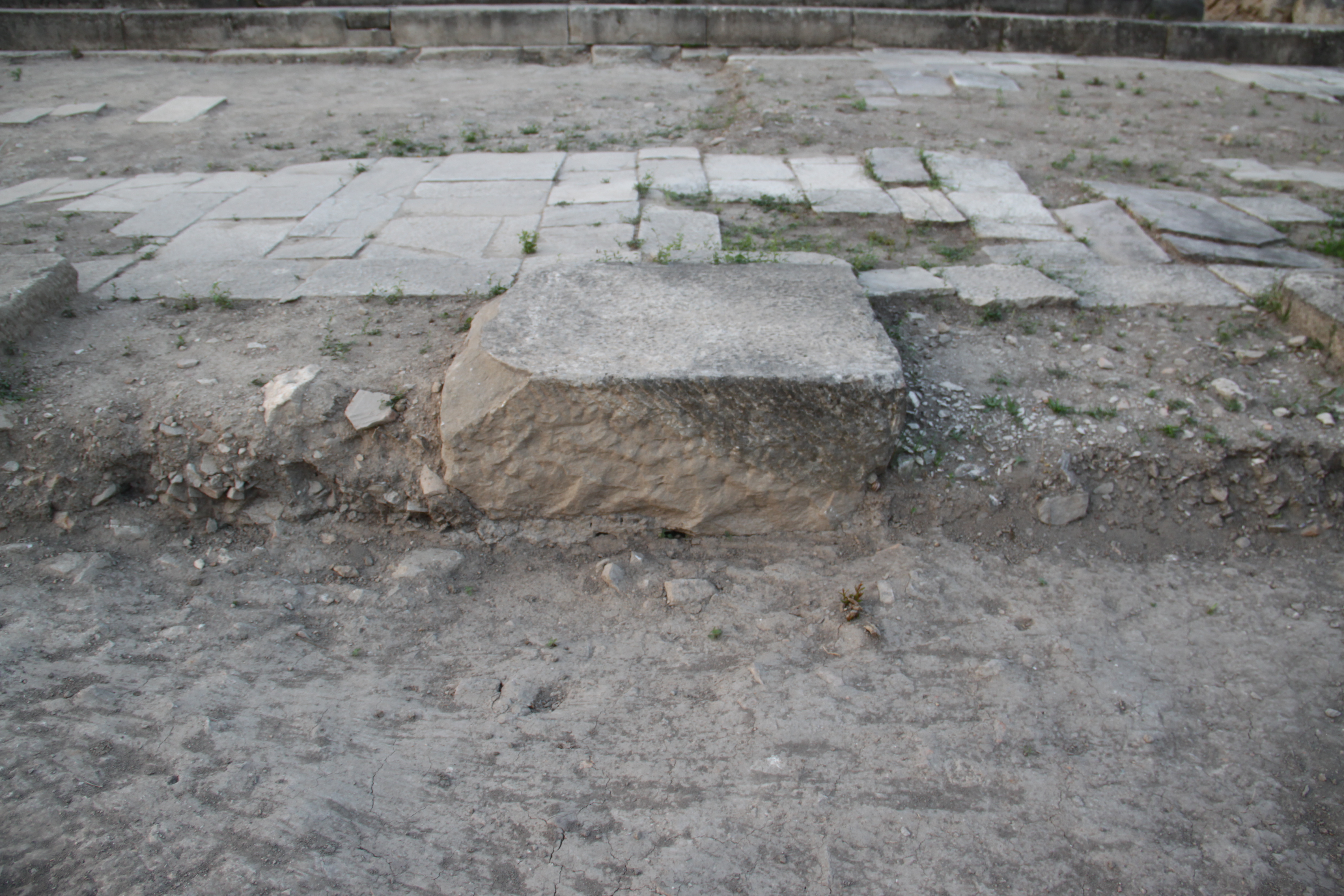 Chisel marks are visible across the whole of the upper surface, whereas only part of the sides of the block are dressed. Mortar is present on the top surface where the column base would have once been located.