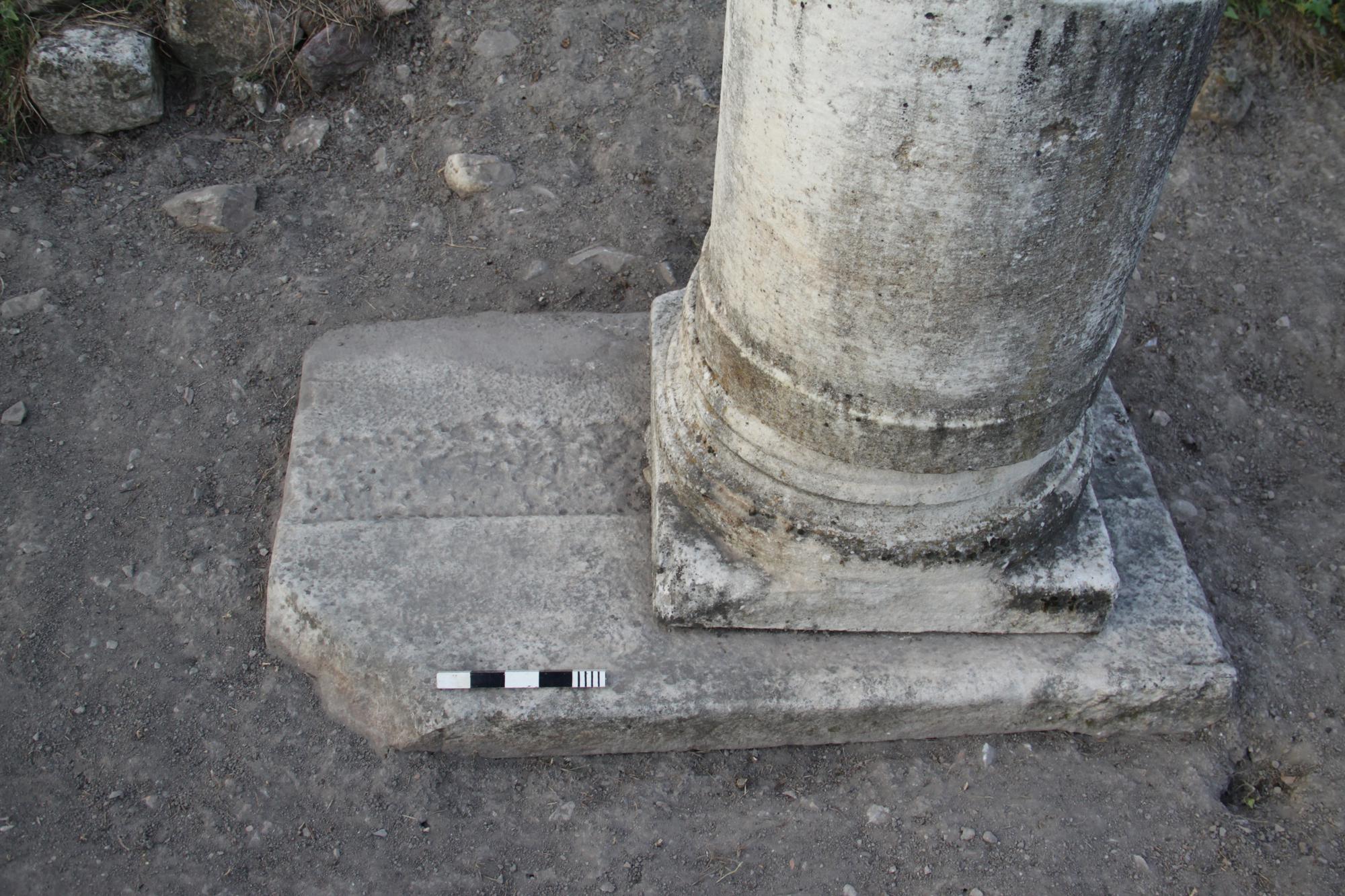 Full measurements and description are unavailable due to the current state of preservation. However, the size, cuttings, and previous wear indicate that this block has been reused. A long thin cutting on its upper face suggests that it previously served as a stylobate block beneath a partition, pro…