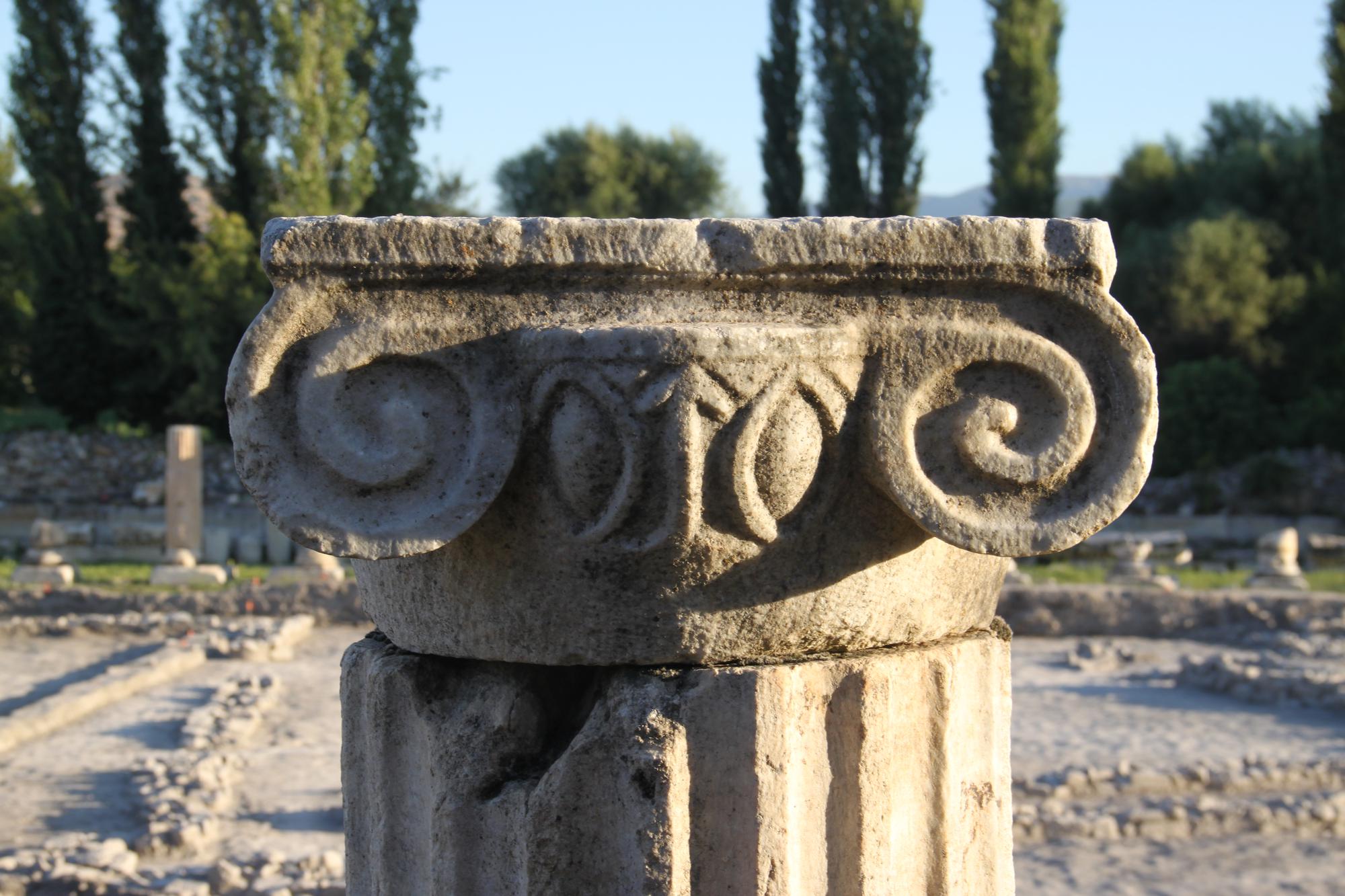 Partially fluted; composed of four drums carved from Aphrodisian blue marble. The second drum is partially fluted, with fillets that are very unevenly spaced and end in a pi-shaped moulding. 0.81 m up the third drum are small cuttings, probably for hanging garland or other fittings.