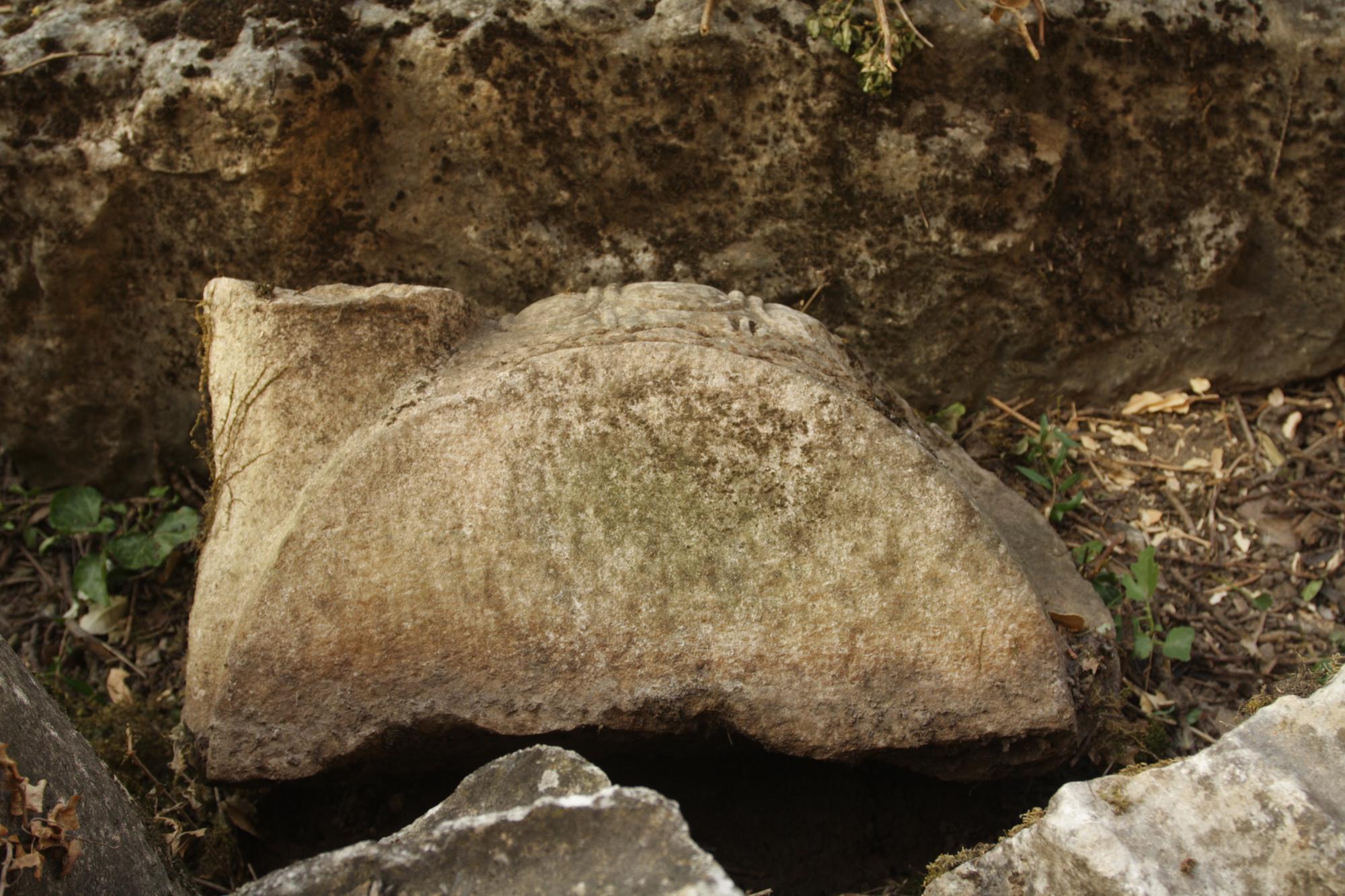 Abacus undecorated. Three-unit godrons taillés, or ovular channels, and two darts across echinus; each godron bordered by a thin, moulded band. Within the two void spaces below where the godrons meet are two small, upward pointing darts. Uneven band of beading below, carved in shallow sunken relief…